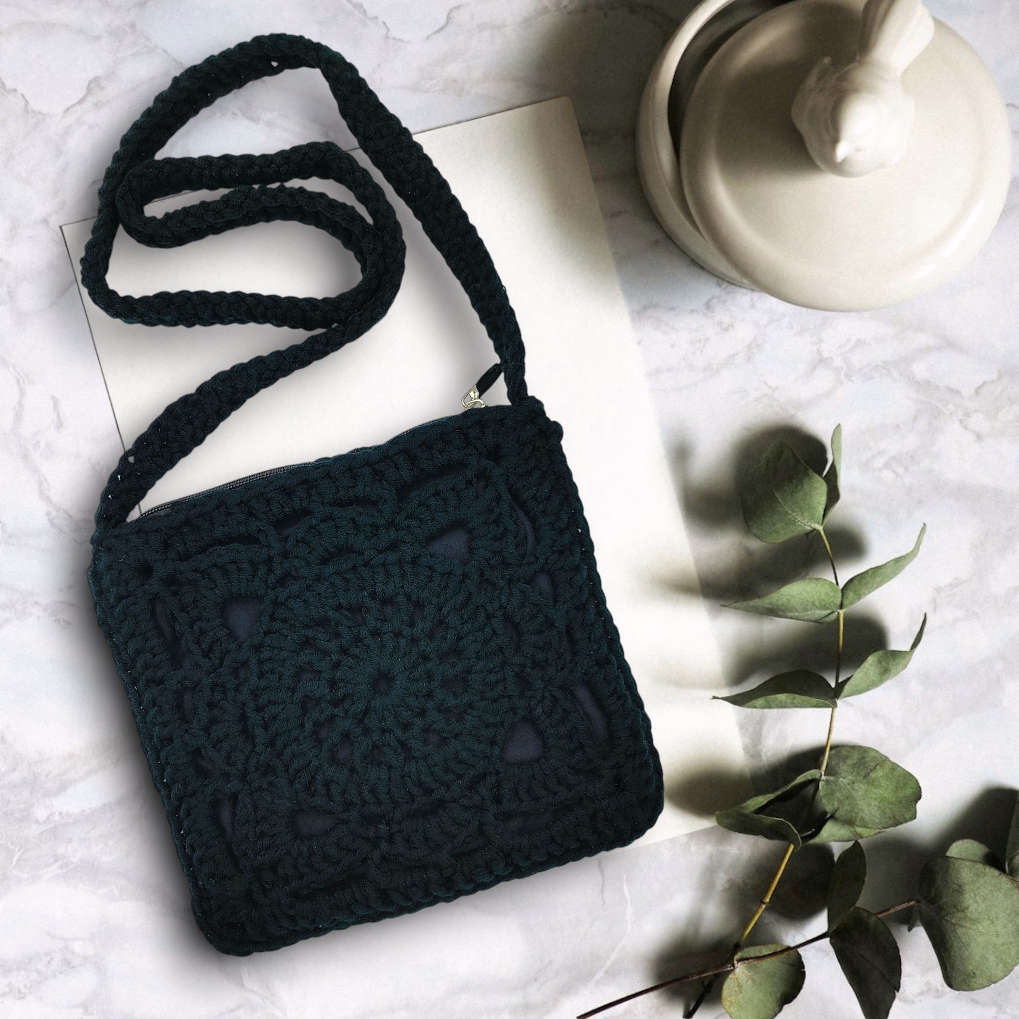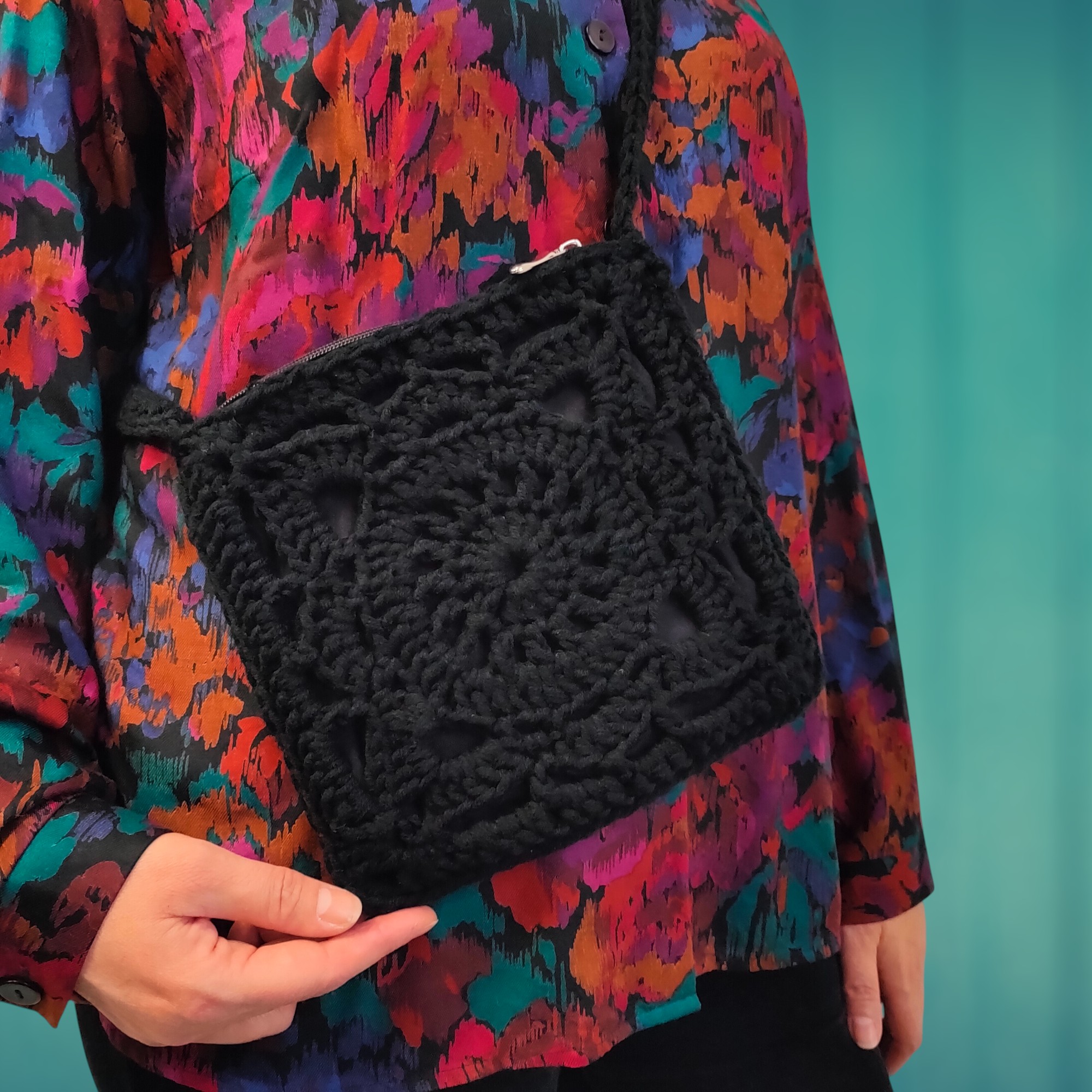 Pomimo niewielkich rozmiarów, ta czarna torebka na szydełku idealnie mieści to, co najpotrzebniejsze na wyjścia na miasto lub krótkie spacery.
