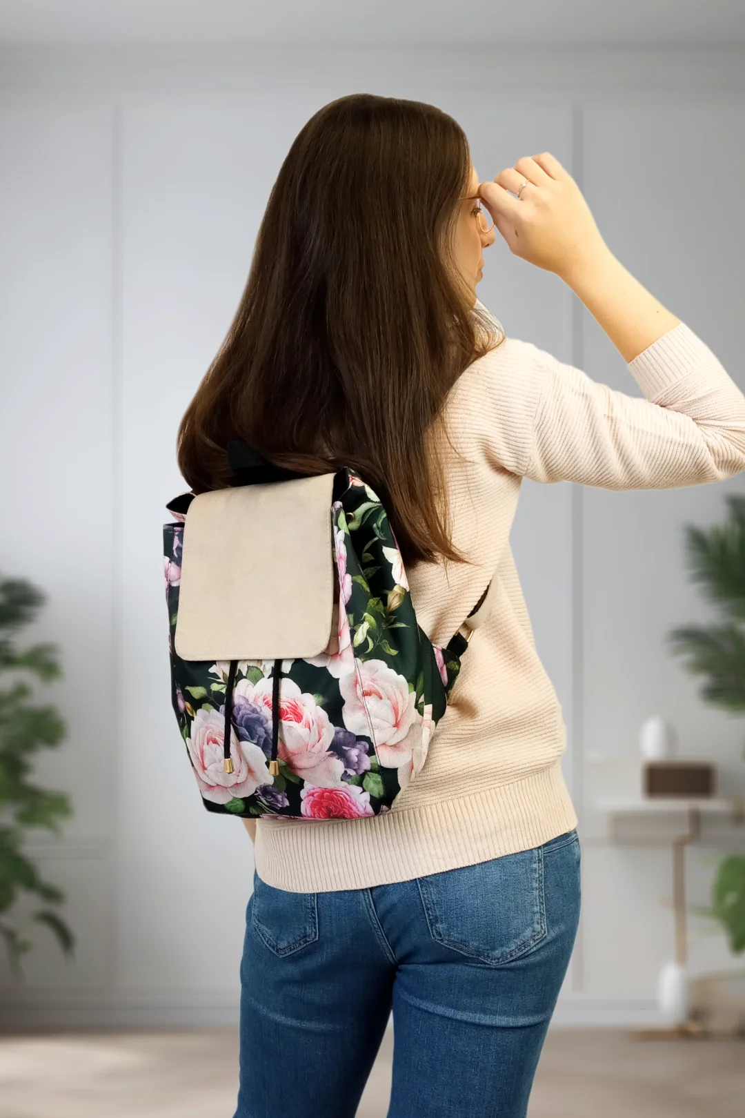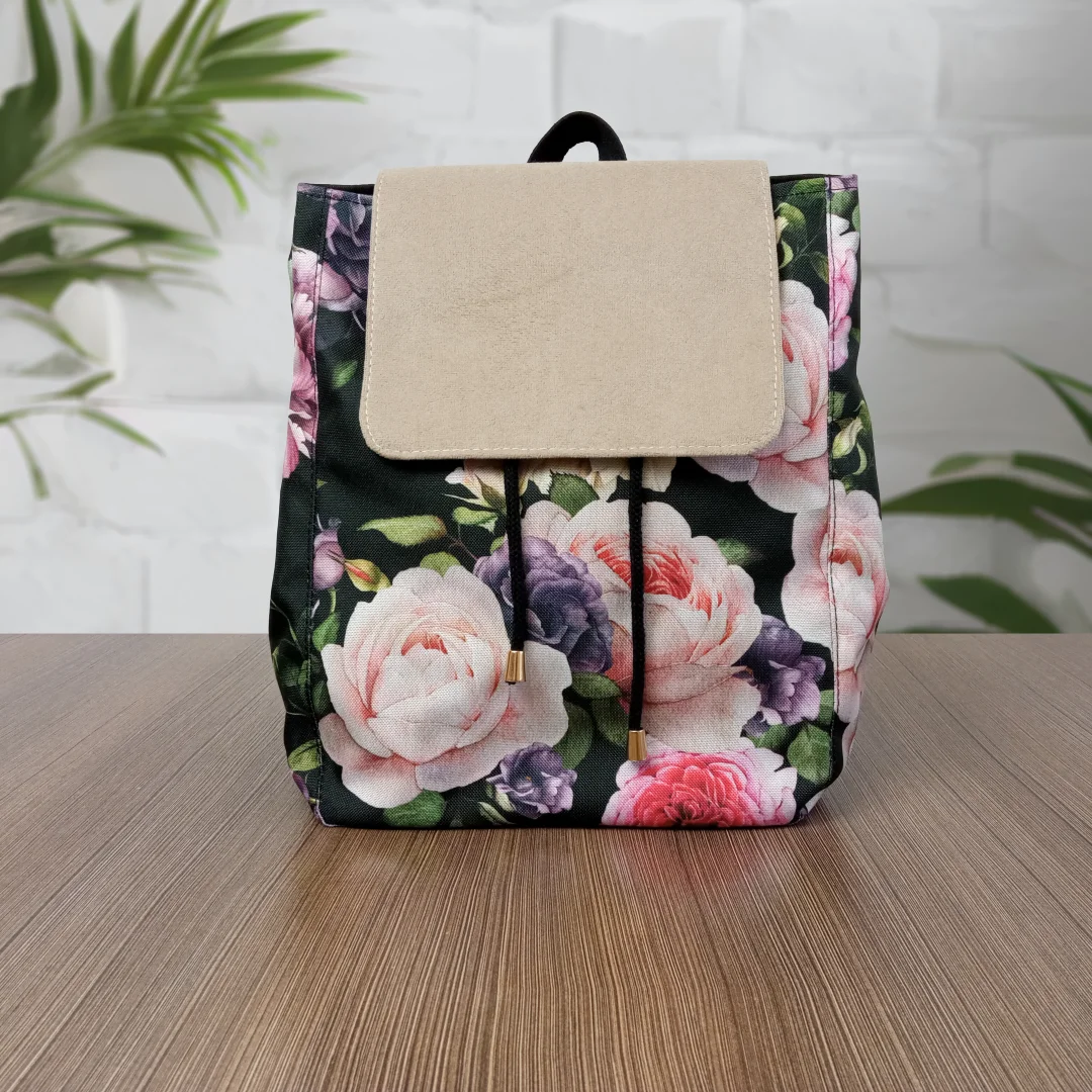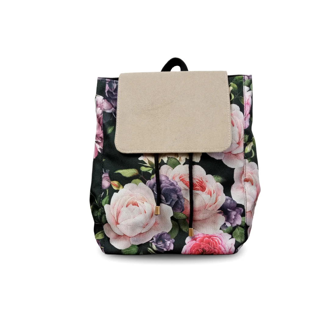 Plecak w róże uszyty jest z wodoodpornej tkaniny z nadrukiem różowych i fioletowych kwiatów. Piękny kwiatowy wzór sprawia, że plecak wyróżnia się z tłumu. Pasuje zarówno do luźnego codziennego stylu, jak i sukienki czy płaszcza. klapka wykonana została z beżowego weluru.