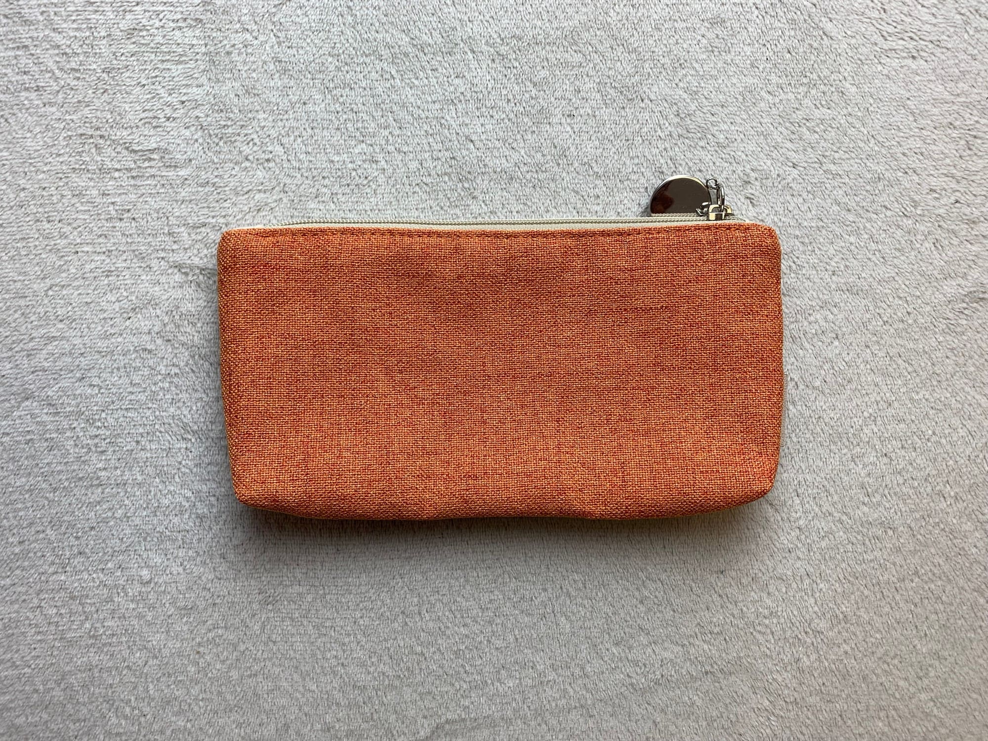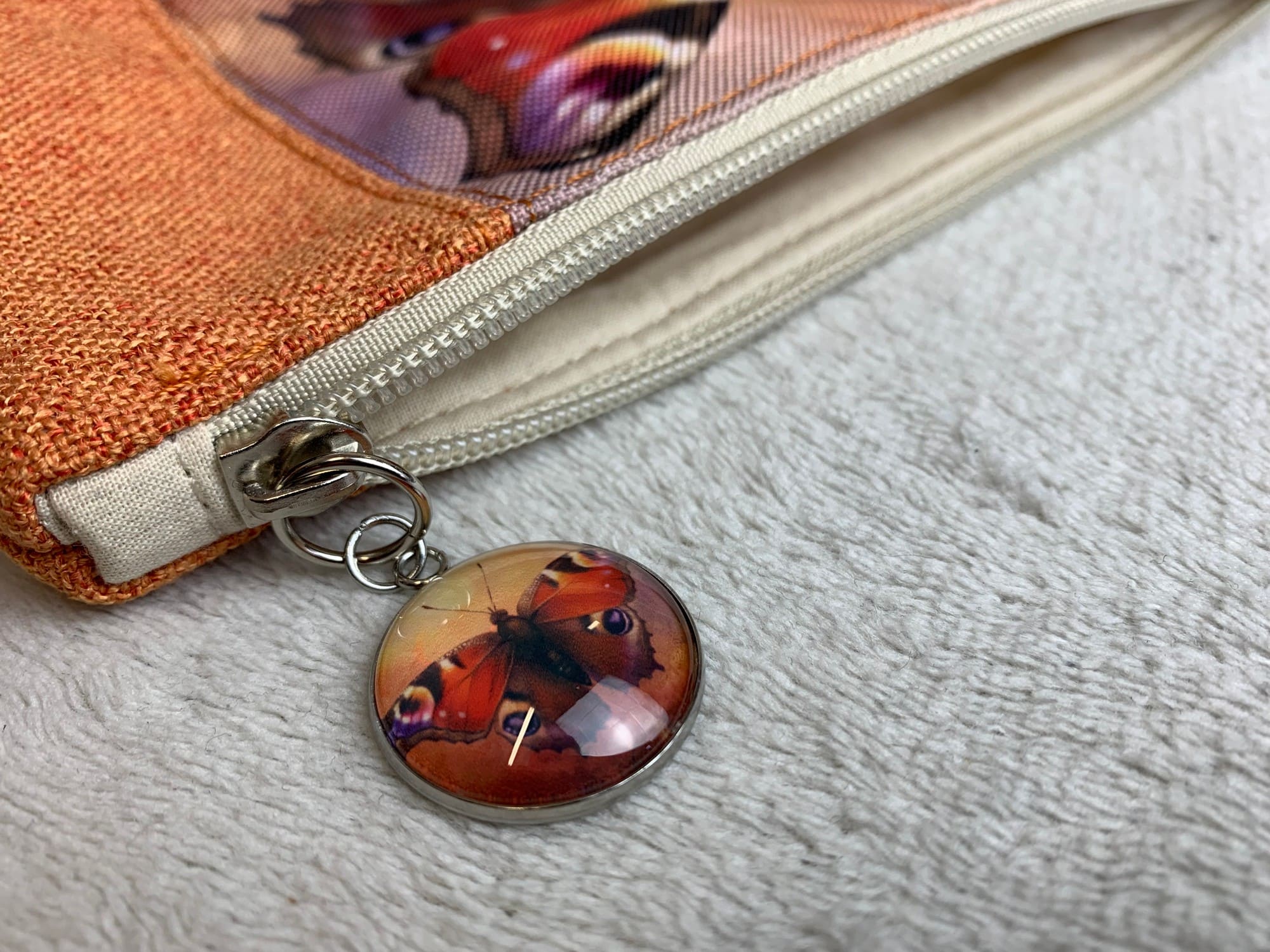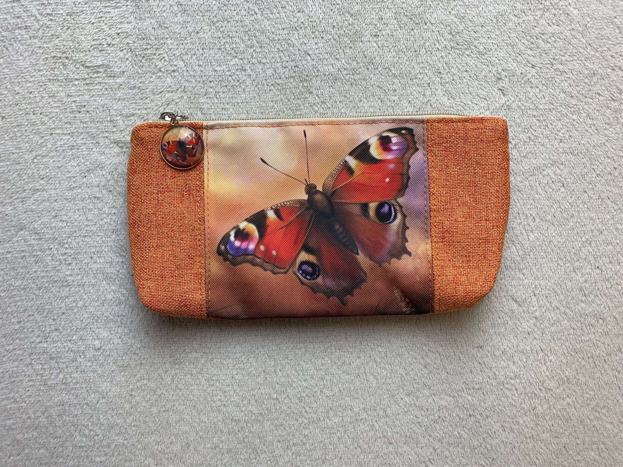 Kosmetyczka została uszyta z tkaniny o płóciennym splocie w pomarańczowym kolorze. Jej wnętrze wykończone jest bawełnianą podszewką, a przód zdobi zaprojektowana w pracowni grafika, przedstawiająca motyla – rusałkę pawik. A jeśli uwielbiasz piękne detale, to z pewnością spodoba Ci się uchwyt suwaka.