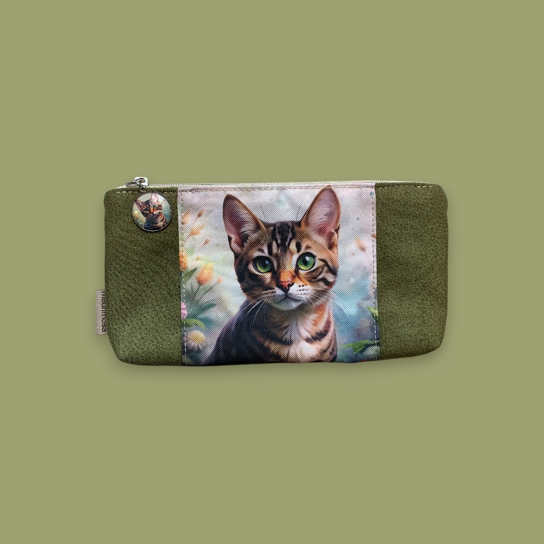 Kosmetyczka została uszyta z zamszowej ekoskóry tapicerskiej w ciemnozielonym kolorze (khaki). Jej wnętrze wykończone jest bawełnianą podszewką, a przód zdobi zaprojektowana w pracowni grafika, przedstawiająca kota w paski. A jeśli uwielbiasz piękne detale, to z pewnością spodoba Ci się uchwyt suwaka.