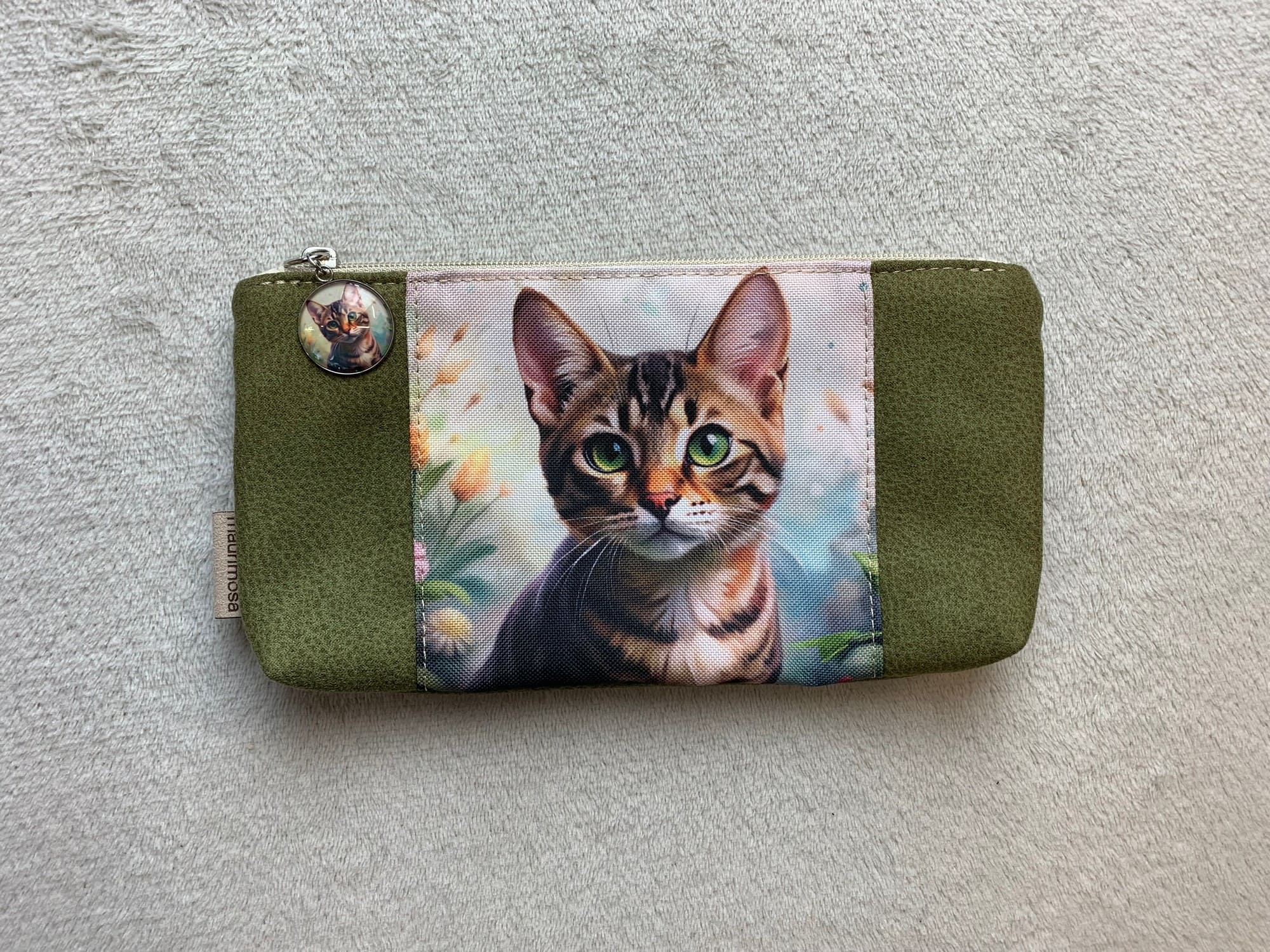 Kosmetyczka piórnik saszetka z pręgowanym kotem – kolor ciemnozielony