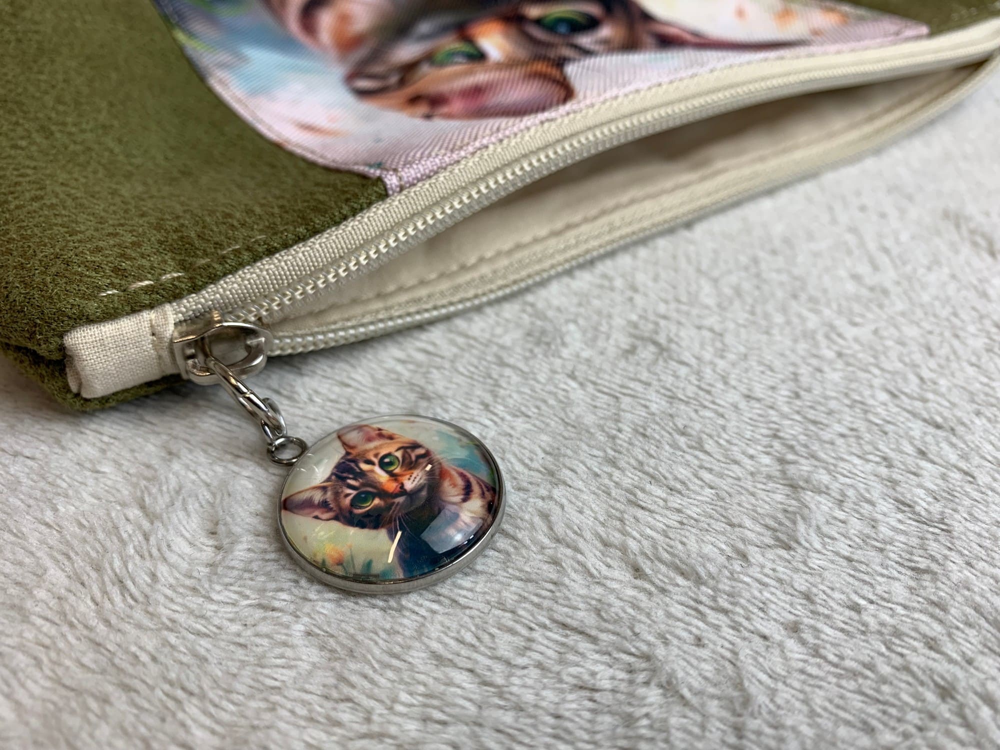 Przyciągająca spojrzenia zielona saszetka z kotem, która może pełnić funkcję kosmetyczki lub piórnika. Oryginalny design z ozdobną zawieszką przy zamku.