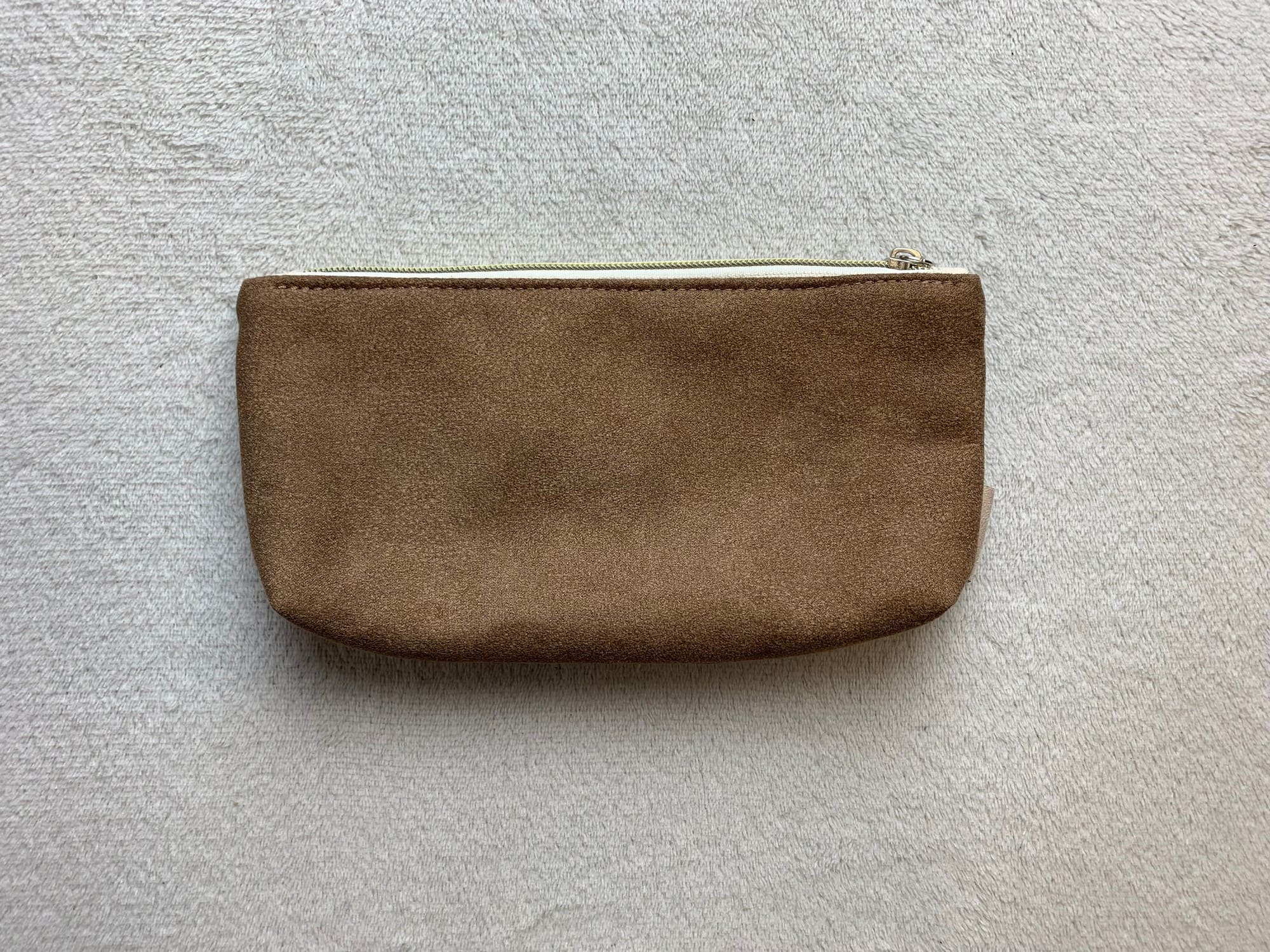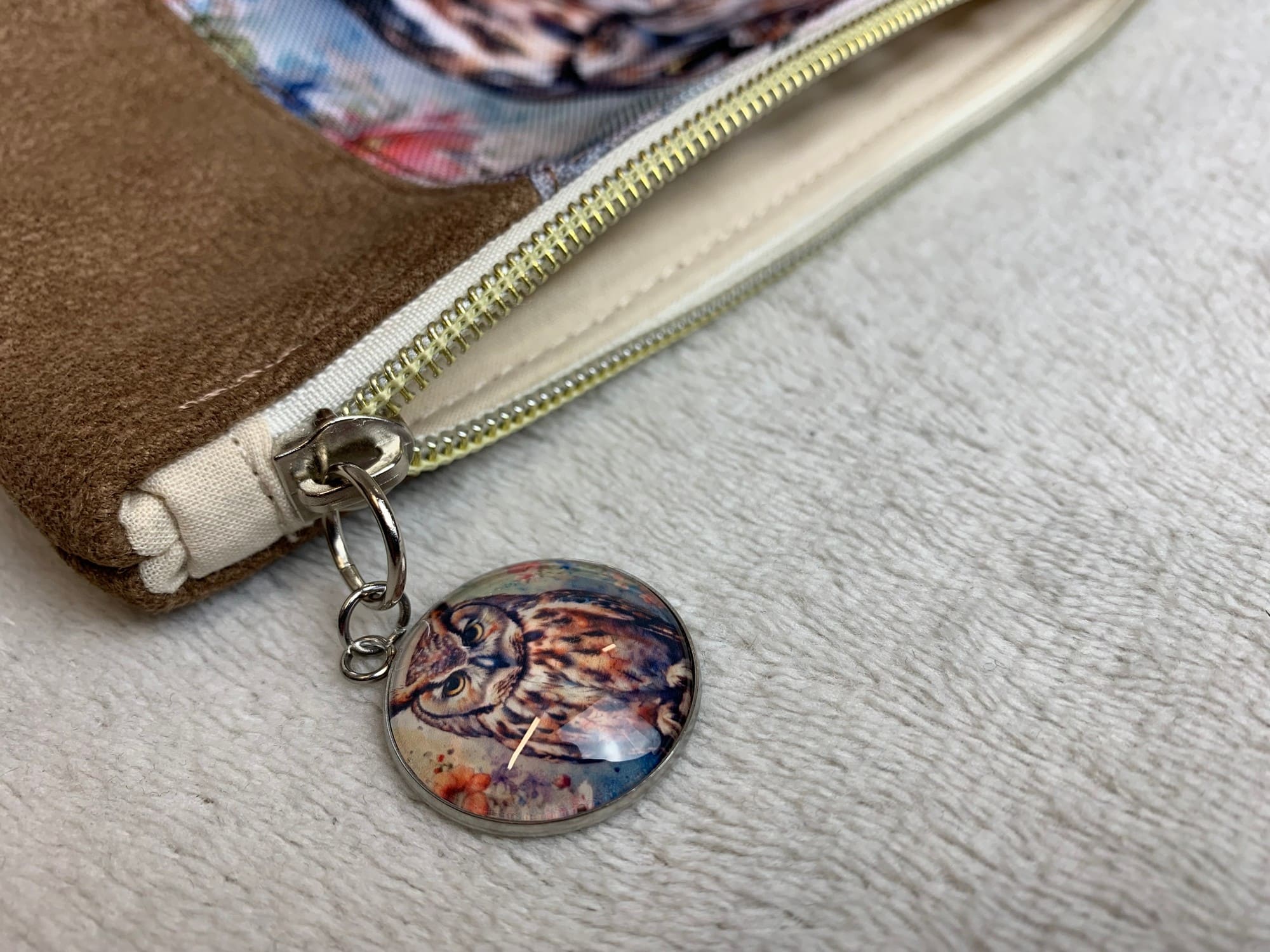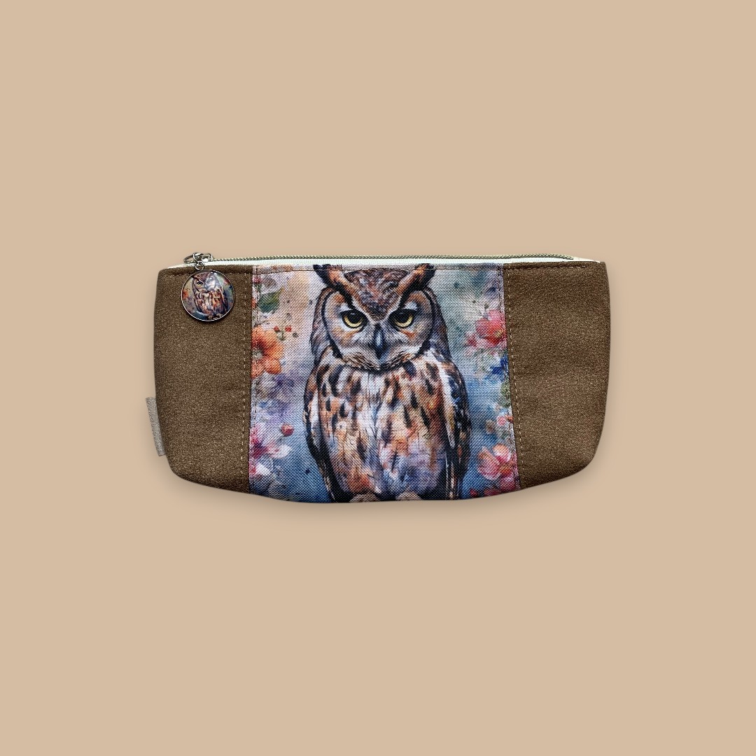 Kosmetyczka została uszyta z zamszowej ekoskóry tapicerskiej w brązowym kolorze. Jej wnętrze wykończone jest bawełnianą podszewką, a przód zdobi zaprojektowana w pracowni grafika, przedstawiająca puchacza. A jeśli uwielbiasz piękne detale, to z pewnością spodoba Ci się uchwyt suwaka.