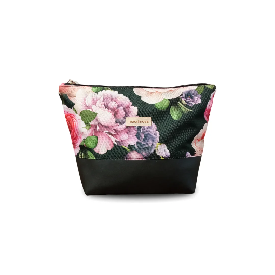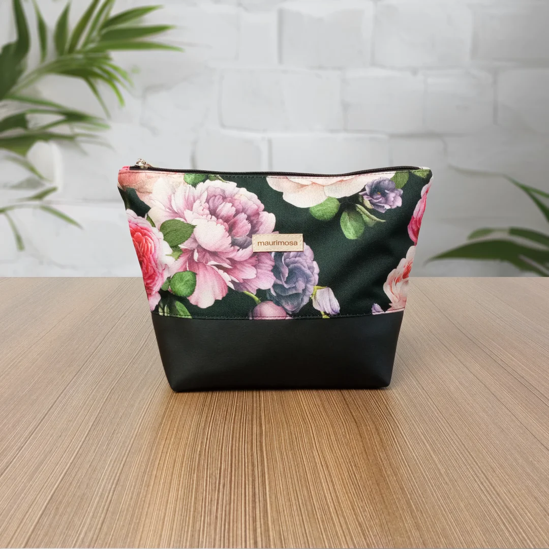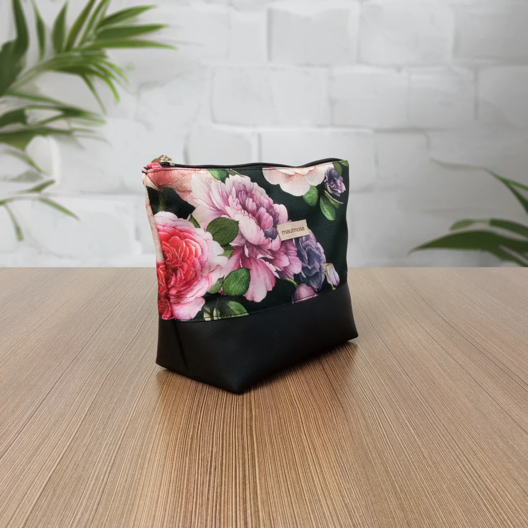 Praktyczna kosmetyczka w róże, z czarnego wodoodpornego materiału oraz ekoskóry świetnie sprawdzi się na weekendowy wyjazd, a nawet długi urlop. Jest pojemna i pomieści wszystkie potrzebne kosmetyki. Dzięki zastosowanym materiałom jest lekka i łatwa do utrzymaniu w czystości.