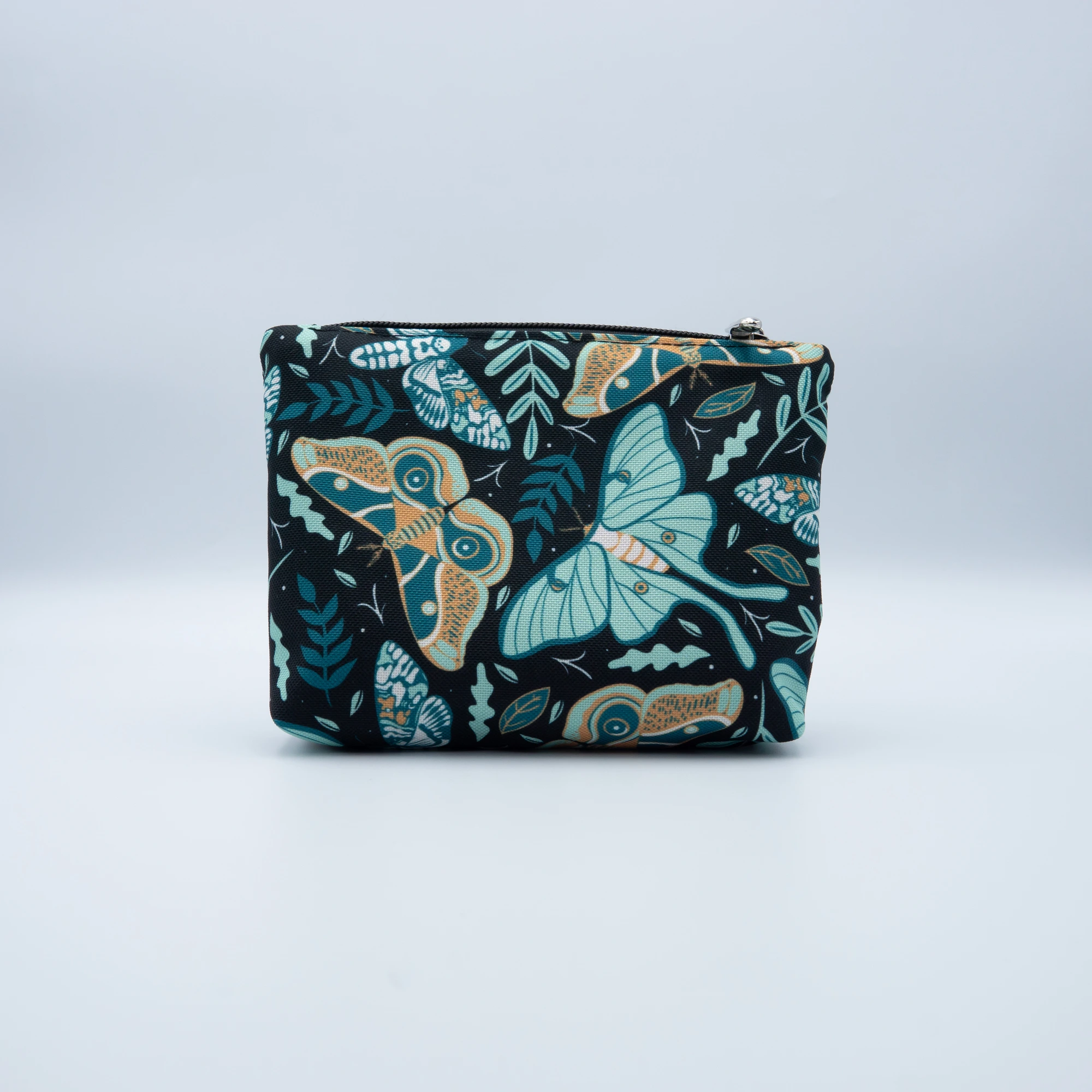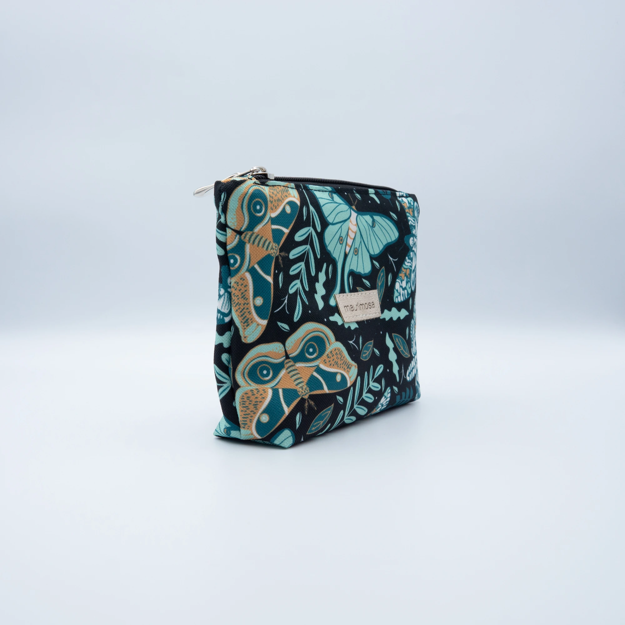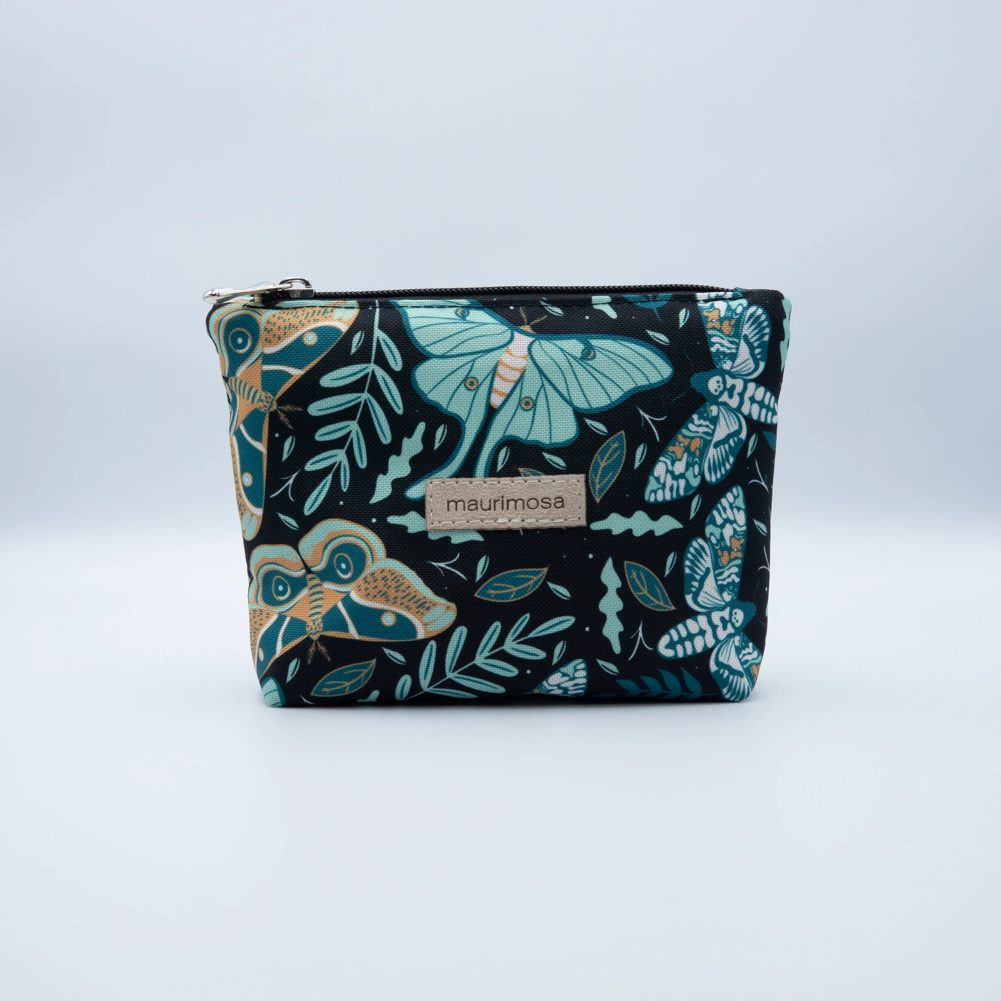 Praktyczna kosmetyczka, z wodoodpornego materiału ze wzorem w turkusowe ćmy świetnie sprawdzi się jako mały organizer do torebki. Pomieści najważniejsze rzeczy, pomagając zachować porządek w torebce – będzie idealna na kilka najpotrzebniejszych kosmetyków, środki higieniczne lub suplementy.