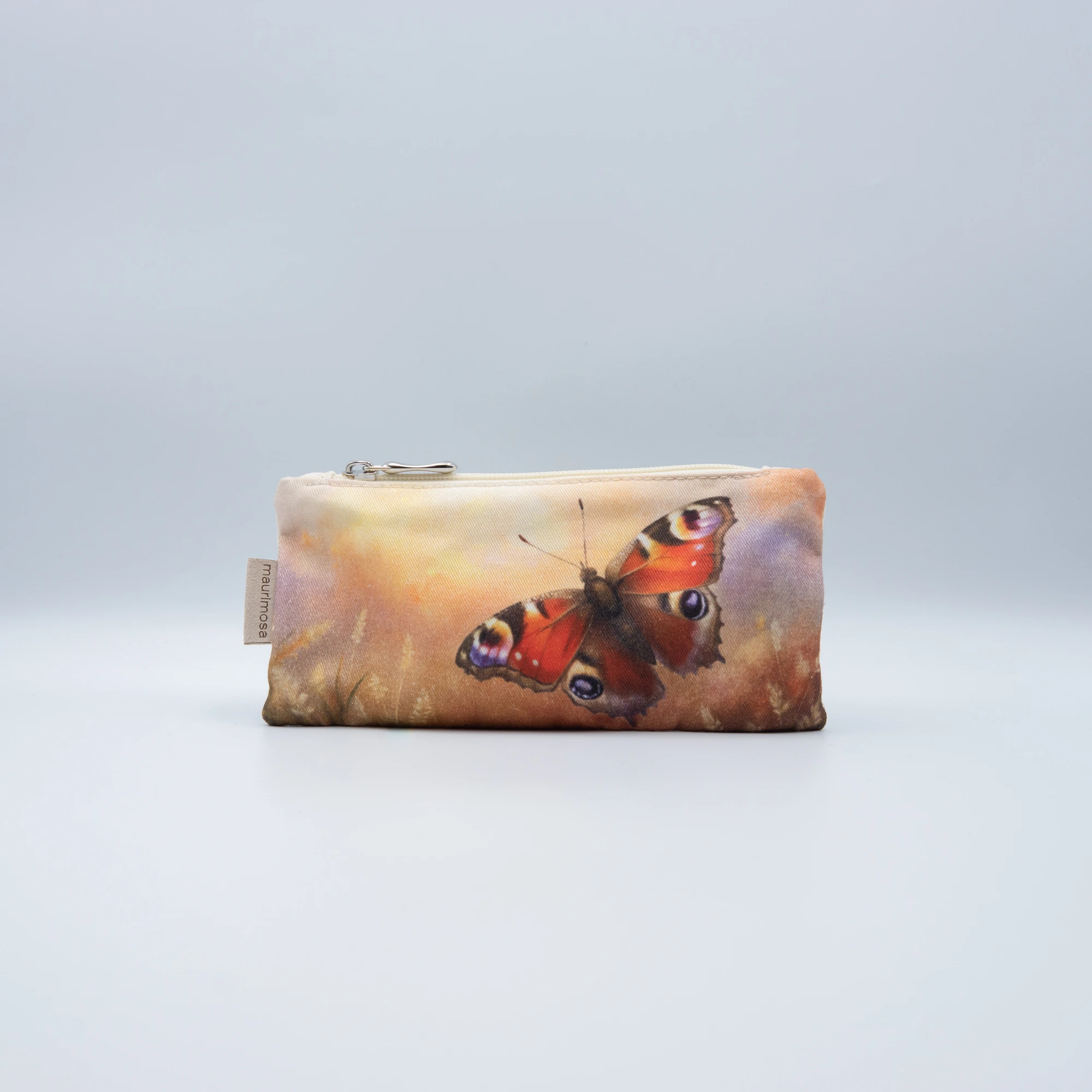 Na przodzie saszetki znajduje się grafika przedstawiająca czerwonego motyla (Rusałka Pawik) na tle łąki. Z tyłu materiał jest jednokolorowy: naturalna niebarwiona bawełna.