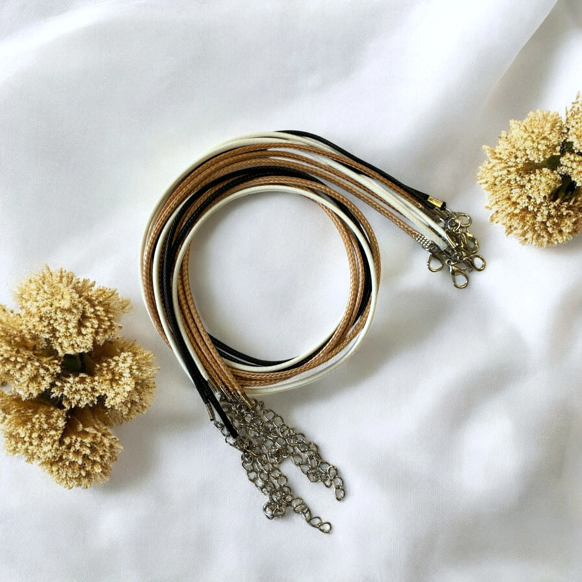 Rzemyk ze sznurka o satynowym wykończeniu jest pięknym dopełnieniem do medalionu z naturalnymi kwiatami. Razem stworzą zgrany duet! Zapięcie jest regulowane o 5 cm, zapinane na klasyczną “rybkę”, w kolorze srebrnym.