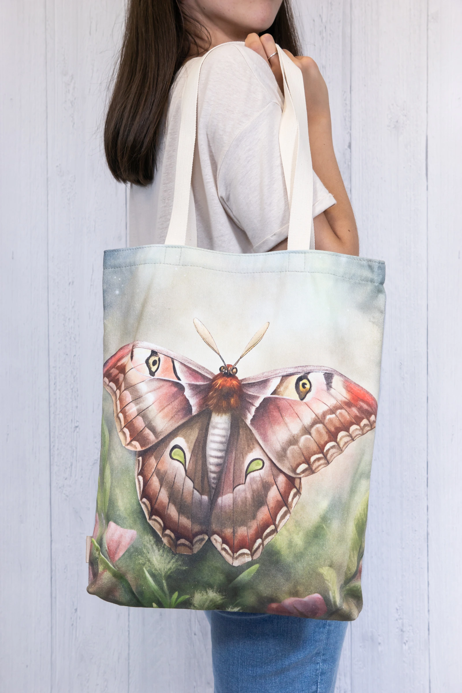 Bawełniana torba na ramię z subtelną grafiką przedstawiającą brązową ćmę to piękny i praktyczny dodatek.