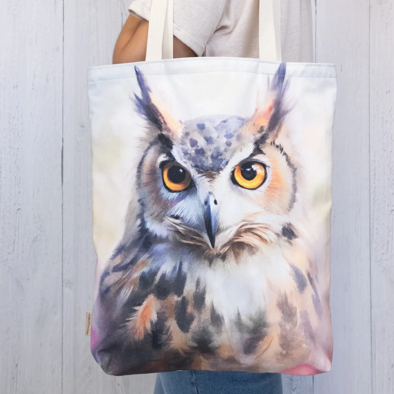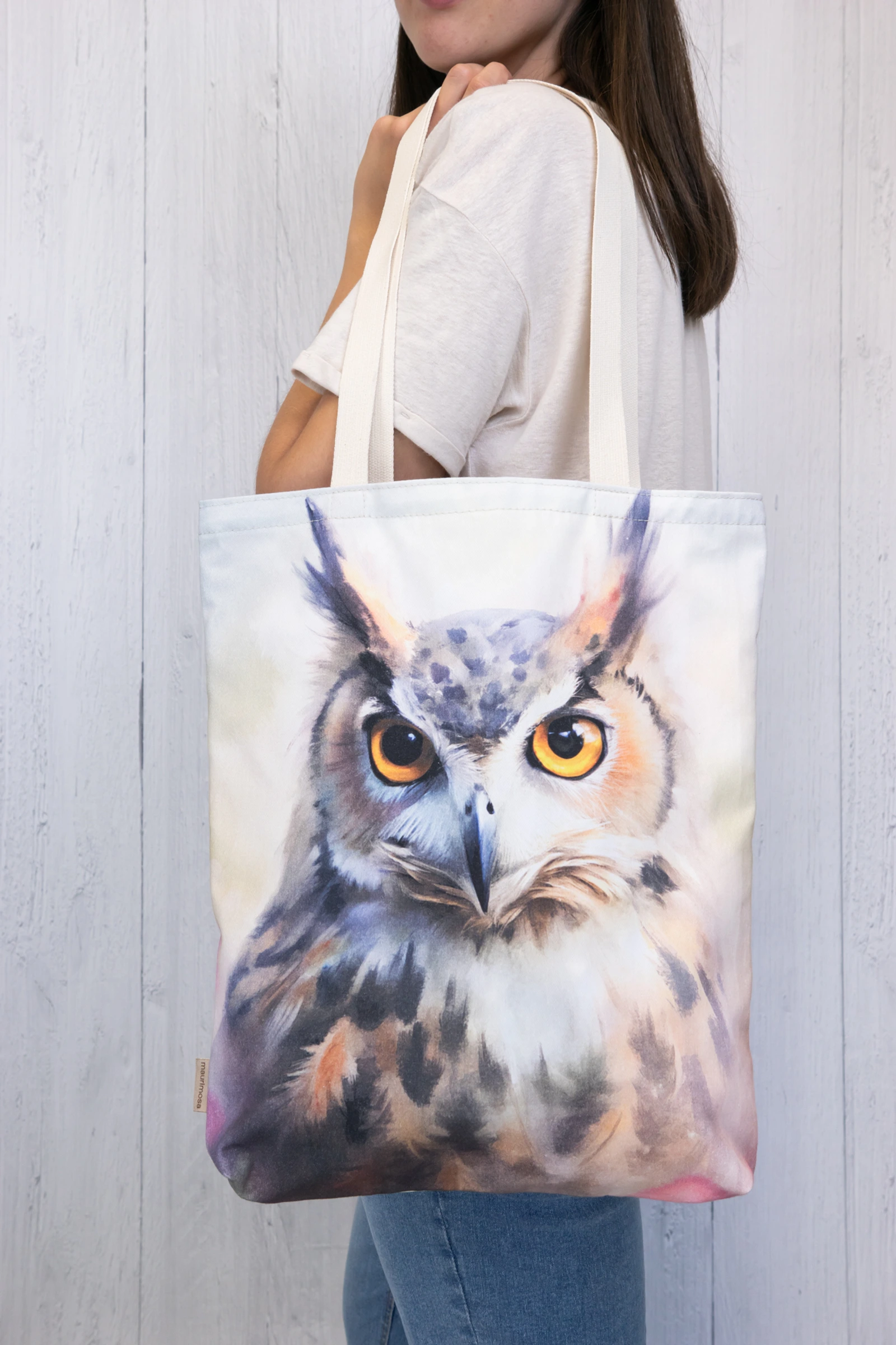 Bawełniana torba na ramię z subtelną grafiką przedstawiającą puchacza to piękny i praktyczny dodatek.