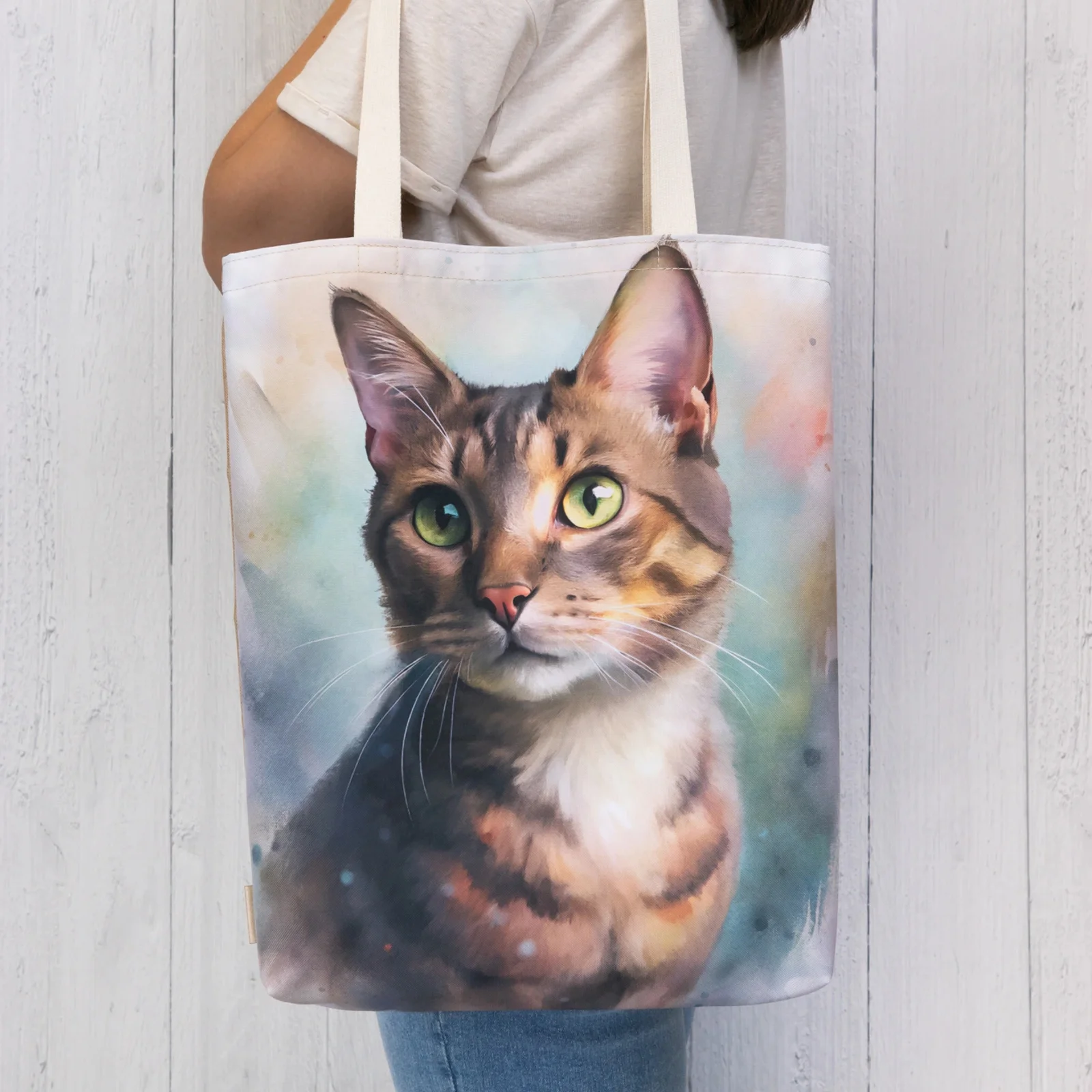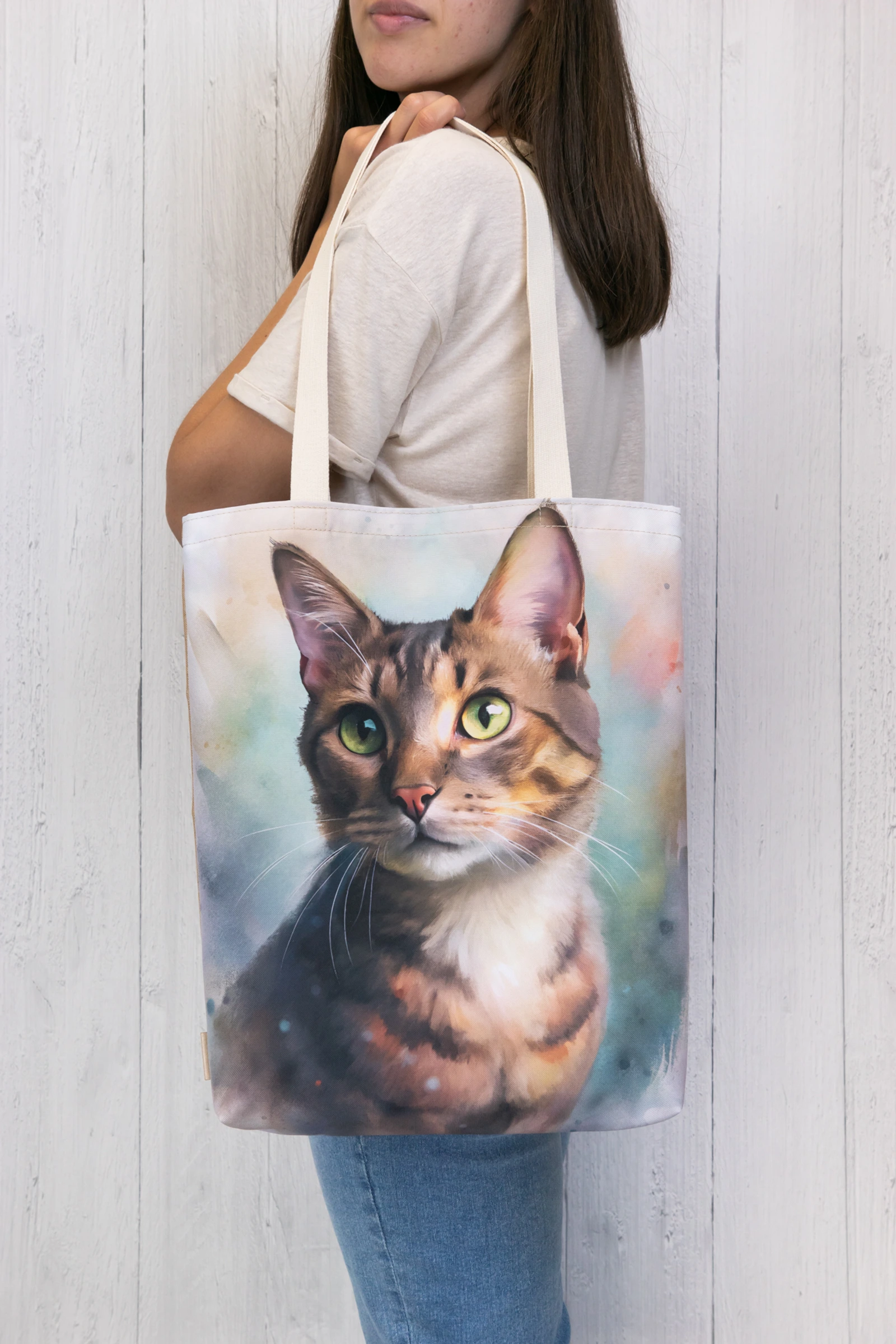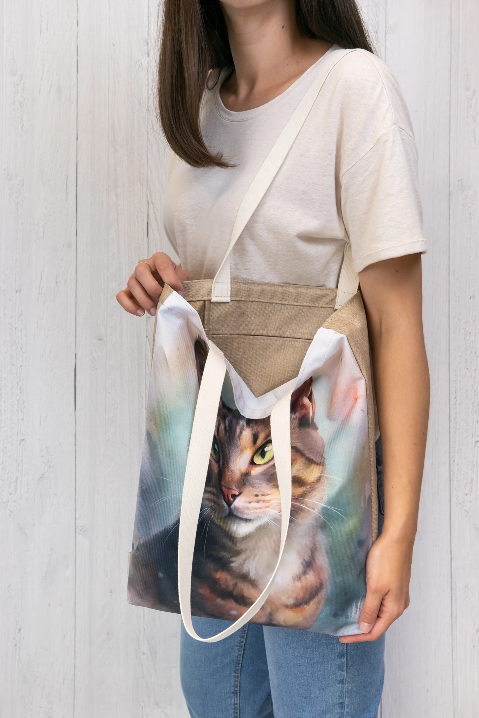 Torba na zakupy z portretem pięknego kota na kolorowym tle.