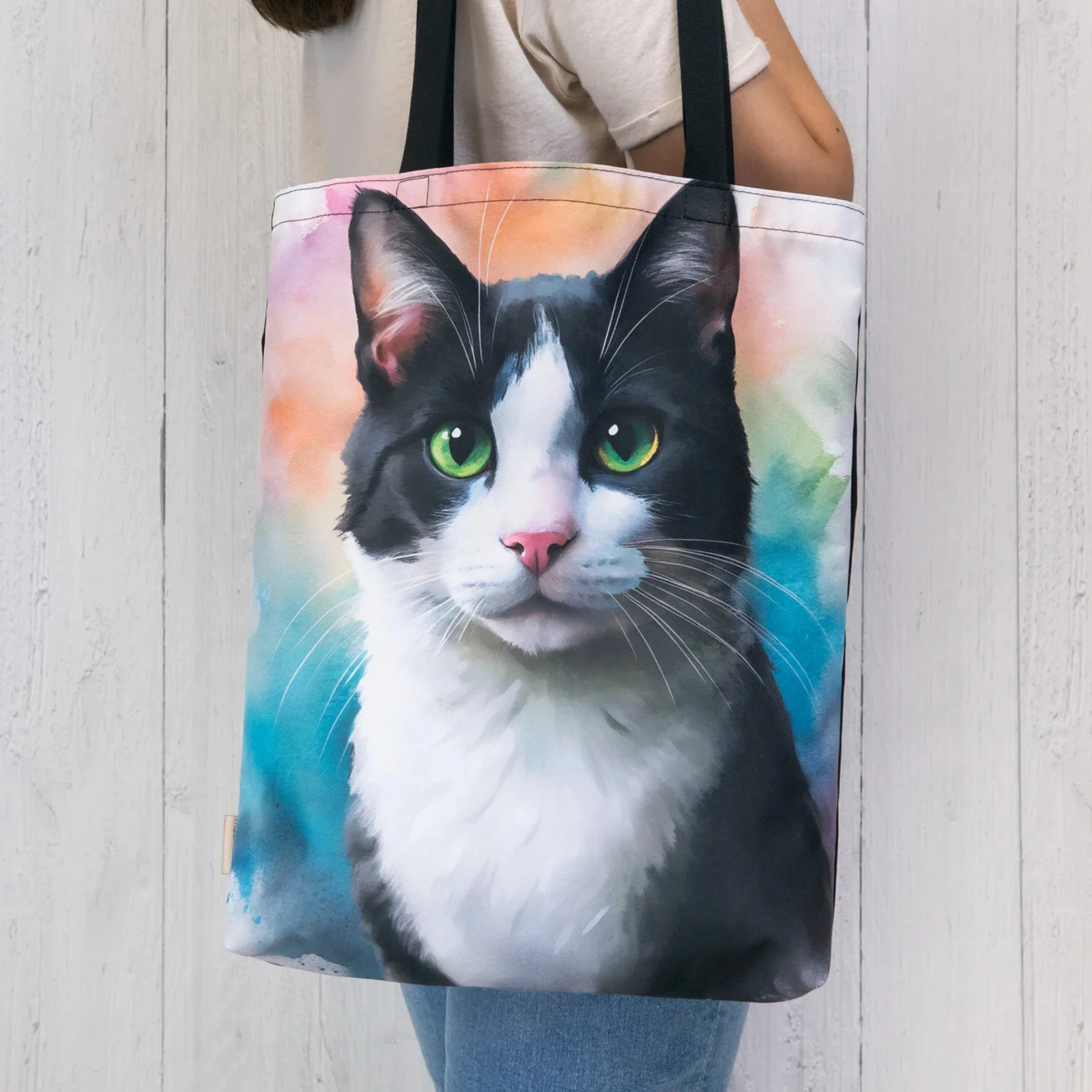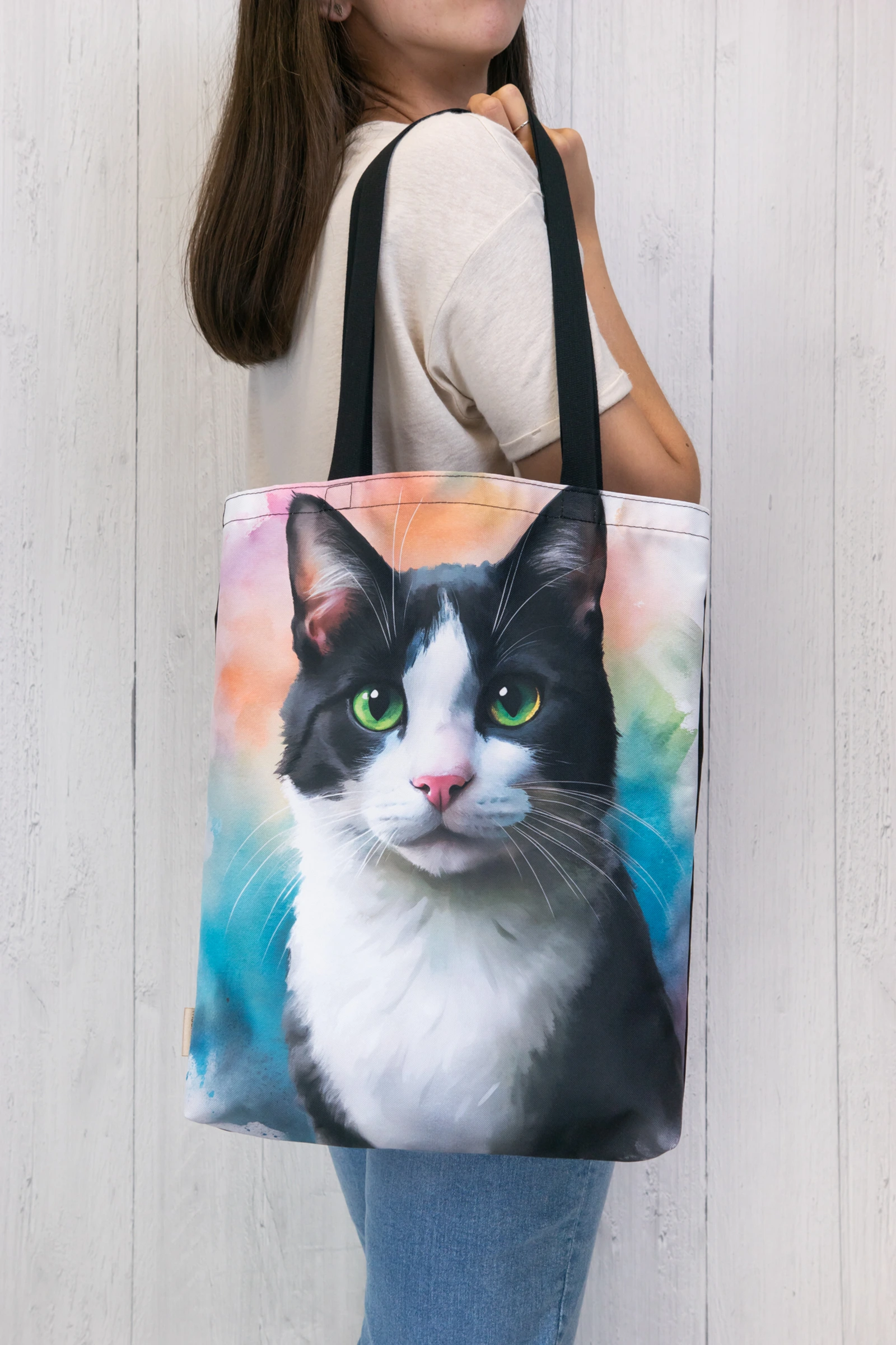 Torba na zakupy z portretem pięknego kota na kolorowym tle.