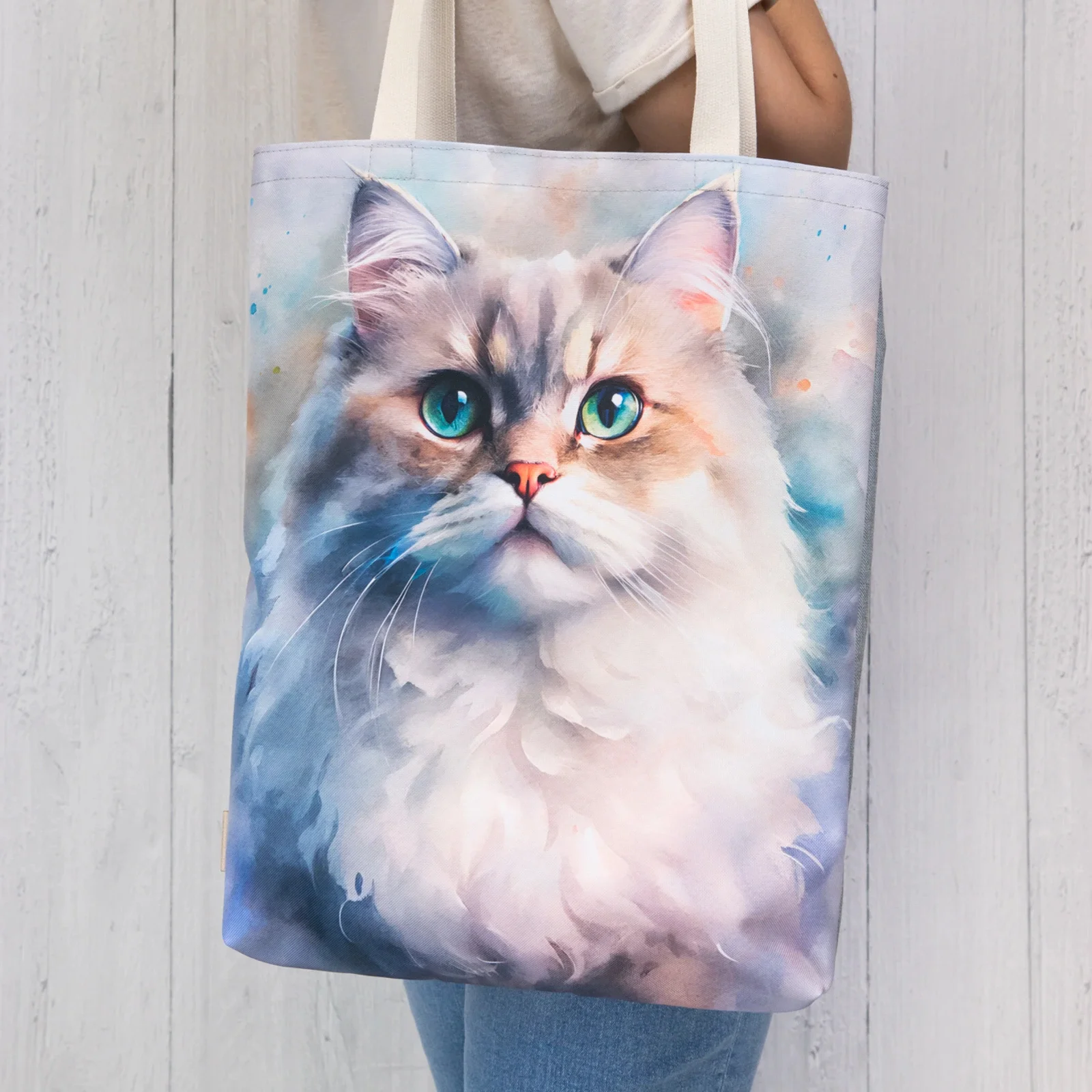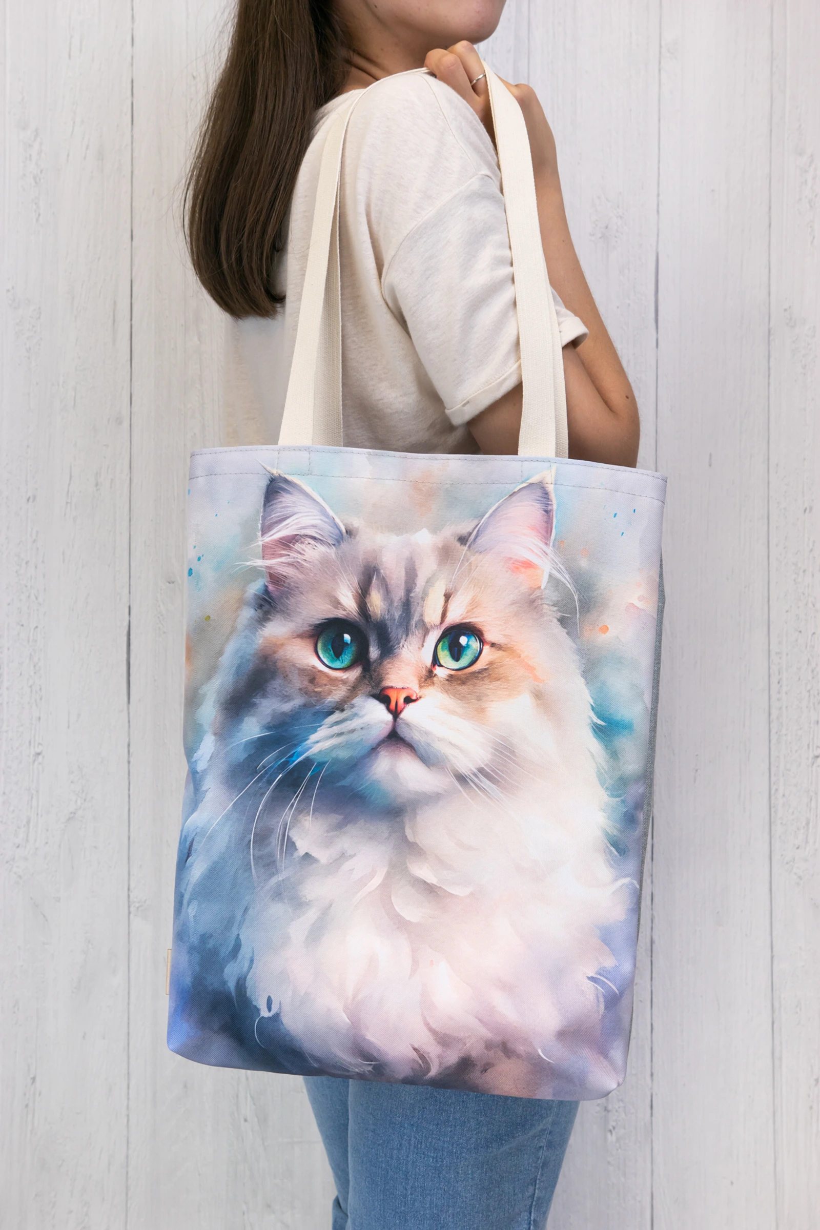 Torba na zakupy z portretem pięknego kota na kolorowym tle.