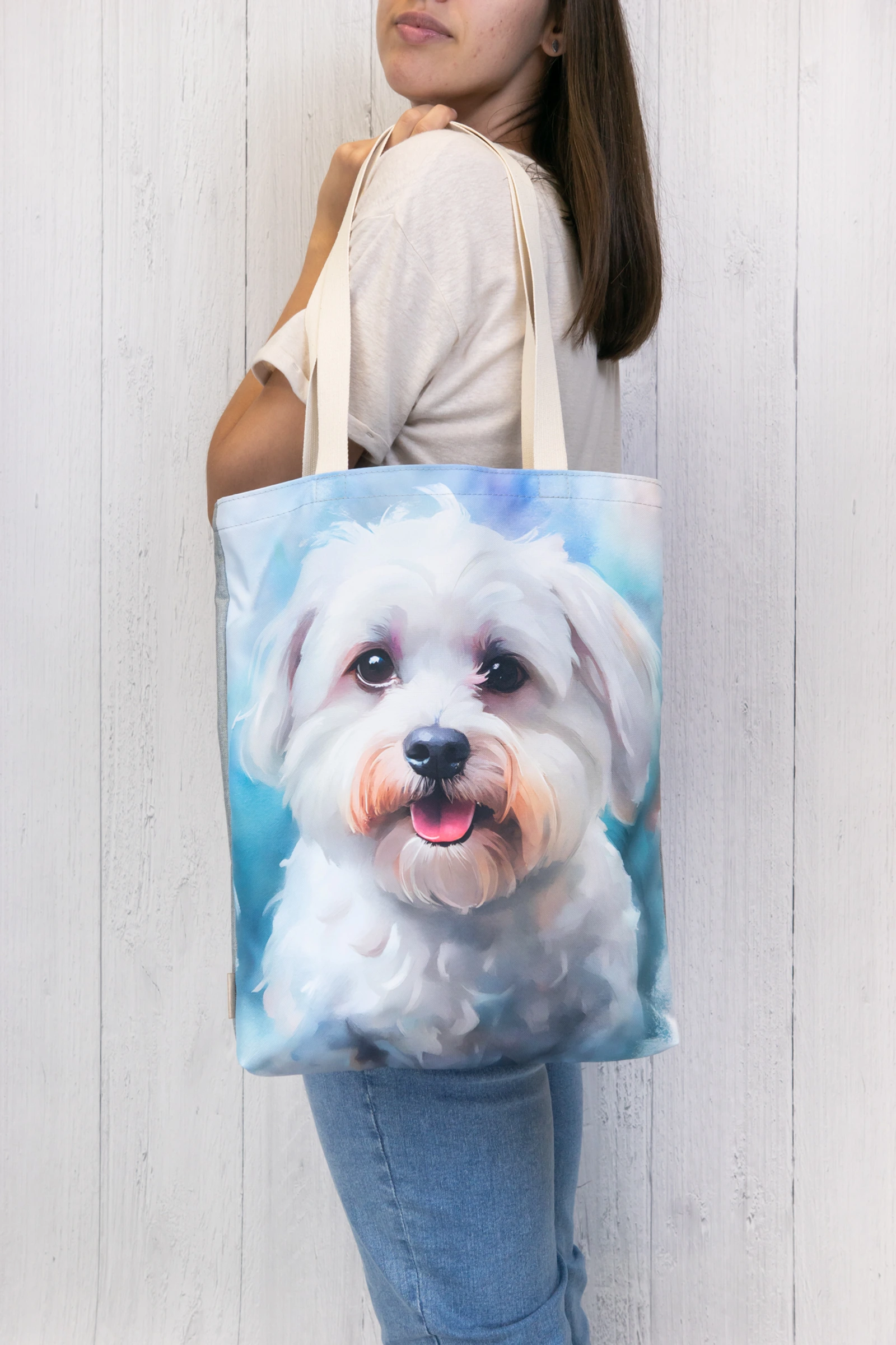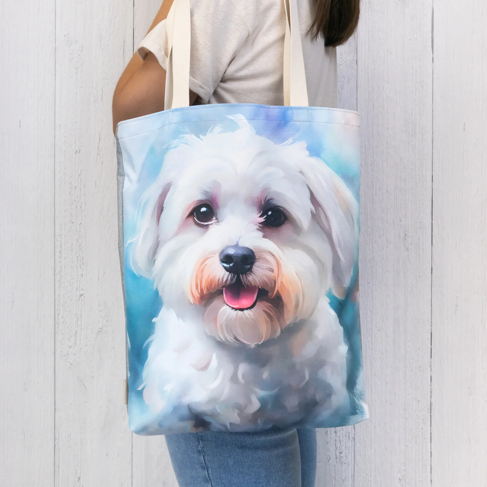 Torba na zakupy z portretem pięknego maltańczyka na kolorowym tle.