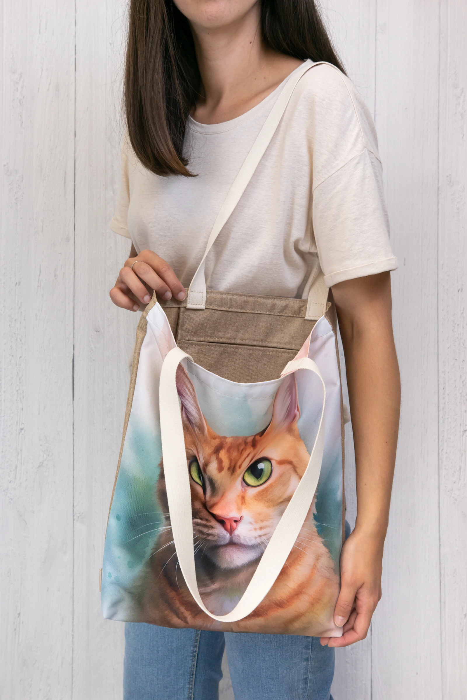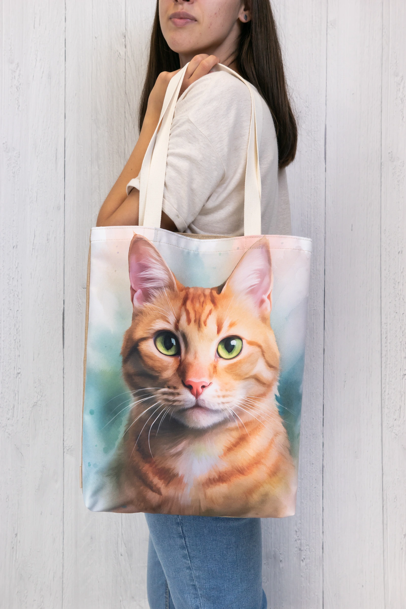 Torba na zakupy z portretem pięknego kota na kolorowym tle.
